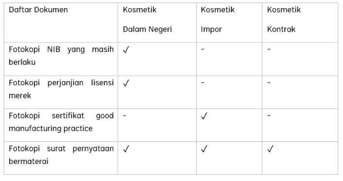 Terdapat dokumen administratif tambahan yang masuk ke dalam kategori kosmetik terbagi menjadi kosmetik dalam negeri, kosmetik impor dan kosmetik kontrak dengan rincian sebagai berikut: