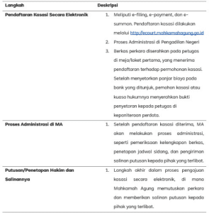 Pengajuan Kasasi Secara Elektronik melibatkan beberapa langkah, seperti pendaftaran kasasi secara elektronik (e-filing), pembayaran panjar perkara secara elektronik (e-payment), dan pemanggilan para pihak secara elektronik (e-summon). Proses Administrasi di Pengadilan Negeri dan Proses Administrasi di MA melibatkan penggunaan sistem informasi secara elektronik untuk mengelola dan mengatur prosedur pengajuan upaya hukum dan persidangan kasasi serta peninjauan kembali. Maka dari itu ada beberapa tahap untuk mengajukan Kasasi Secara Elektronik antara lain:
